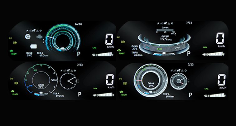 Meter Cluster Multifungsi dengan tampilan sporty dan atraktif, memiliki 4 pilihan tema yang bisa disesuaikan serta informasi lengkap sistem hybrid